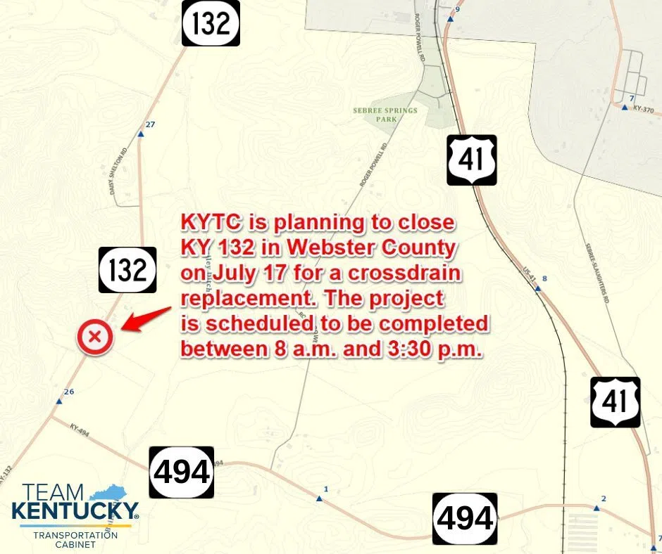 MADISONVILLE, Ky. - The Kentucky Transportation Cabinet is planning a daytime closure on Kentucky 132 in Webster County on Thursday to replace a cross-drain tile at the 26.25 mile point, about a half ...